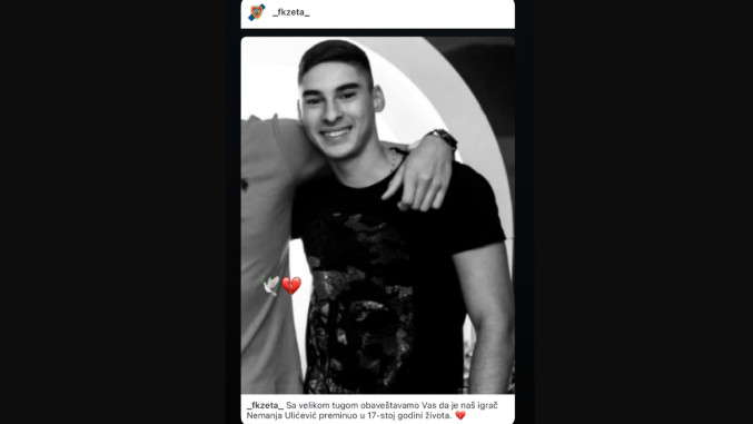 - Са дубоким жаљењем примили смо вест о прераном одласку младог фудбалера ФК Зета, Немање Улићевића, који је преминуо у 17. години.