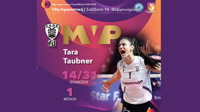 Српски коректор Тара Таубнер проглашена је за најефикаснијег играча 18. кола Суперлиге Грчке. У дресу ПАОК-а, МВП признање заслужила је са 15 поена (14 из напада и један блок), као најбољи поентер тима у победи 3:0 над Заоном, чиме су додатно учврстили пето место на табели.