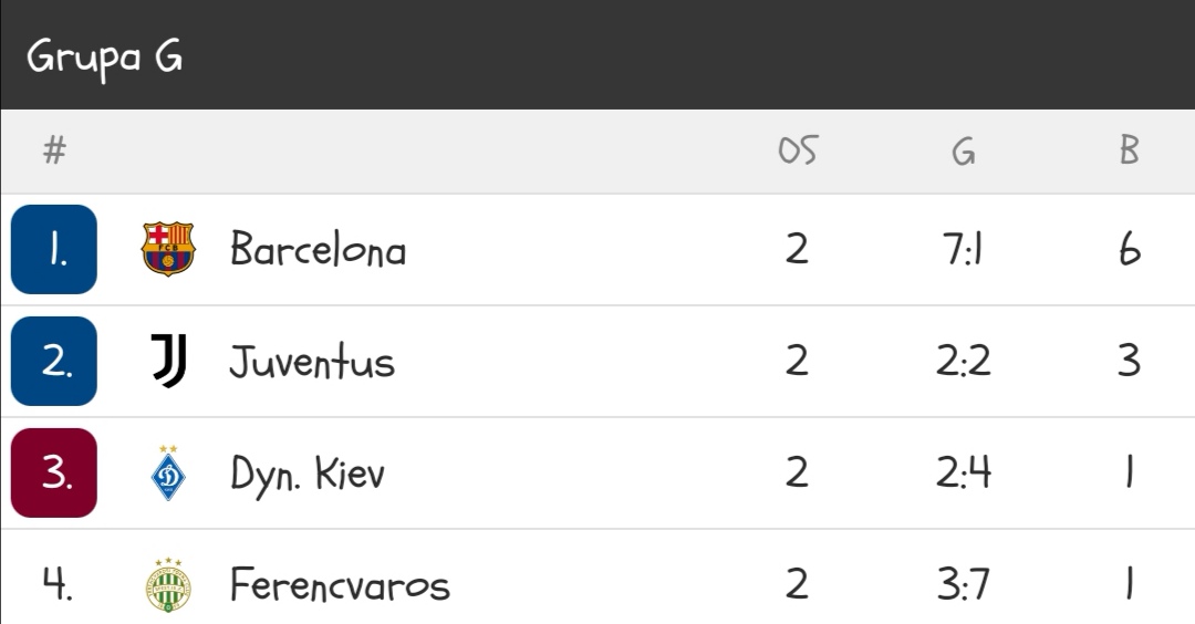 Posle dva kola Barselona je prva u grupi sa šest bodova, Juventus je osvojio tri, dok su Ferencvaroš i Dinamo Kijev upisali po jedan bod.