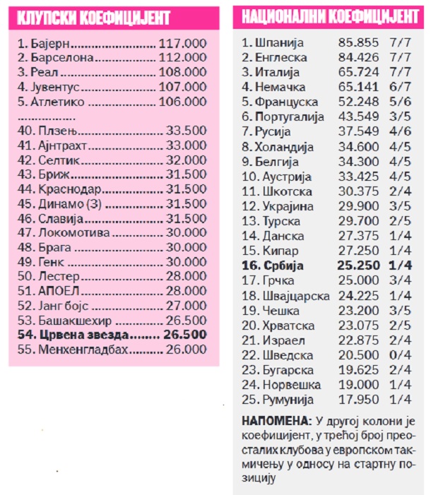 Crvena zvezda paralelno sa borbom za nacionalni koeficijent vodi i za klupski. Napravila je proboj na 54. mesto i ima dobre šanse da izvrši dodatni napredak.