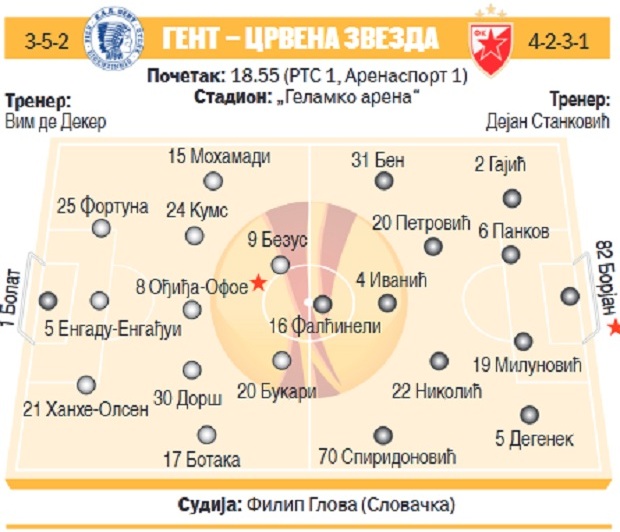 - Postoje problemi sa povredama, ali one su sastavni deo fudbala i o tome sam mnogo pu-ta pričao. Činjenica je da ćemo igrati bez petorice koji su igrali u Beogradu protiv Genta, ali imamo 20 startera. Znam koje smo fudbalere ostavili kod kuće i koliko oni znače za Zvezdu, ali nema alibija. Na nama je da se adaptiramo na situaciju. Imamo ekipu koja će se suprotstaviti Gentu i ona je spremna za meč. Videćete kakav će tim izaći, ve-rujem u sve njih. Nećemo da se branimo – istakao je Dejan Stanković, šef stručnog štaba Crvene zvezde.