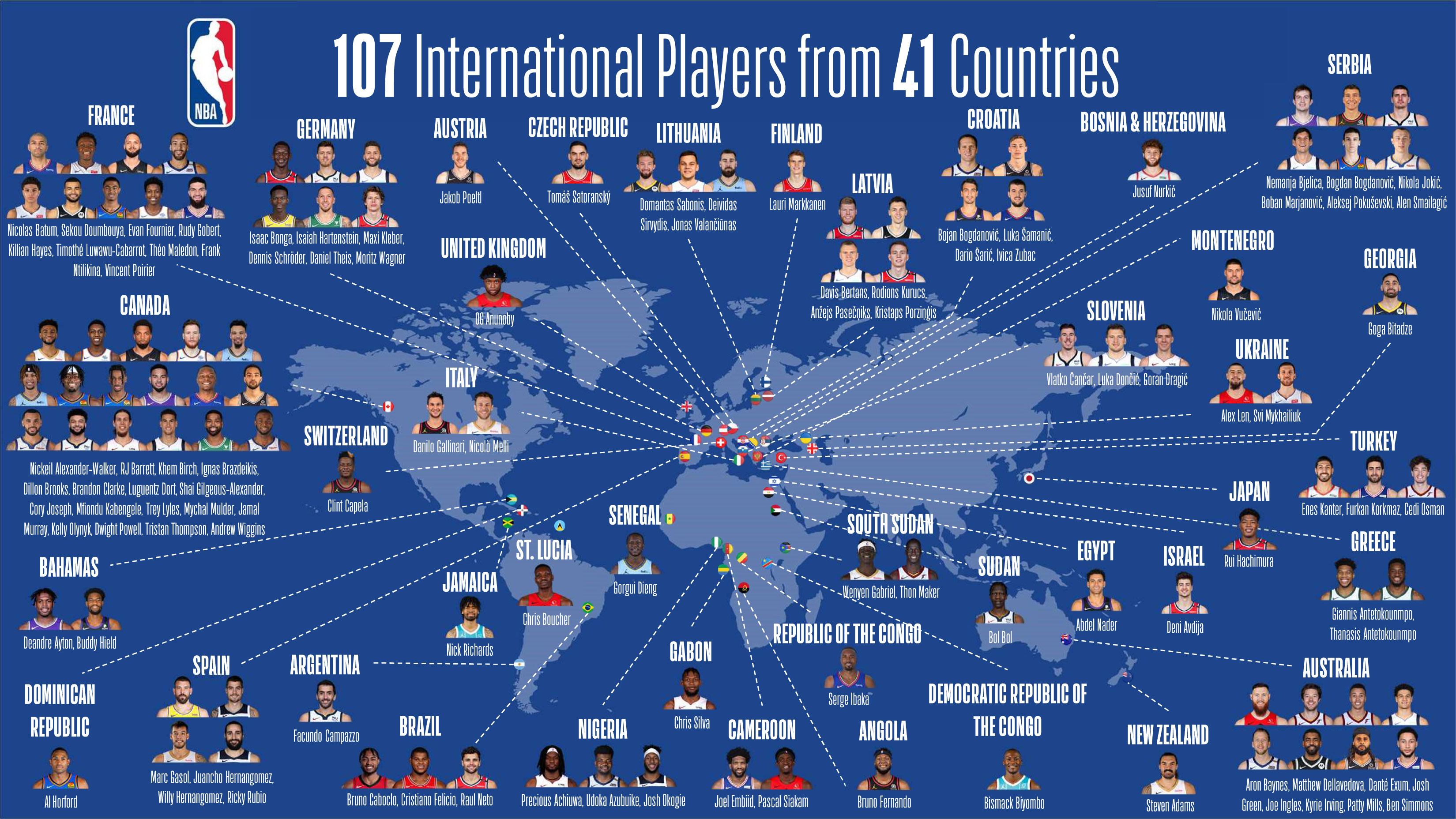 Srbiju u NBA predstavljaju Nikola Jokić (Denver), Bogdan Bogdanović (Atlanta), Nemanja Bjelica (Sakramento), Boban Marjanović (Dalas), Aleksej Pokuševski (Oklahoma), Alen Smailagić (Golden Stejt).