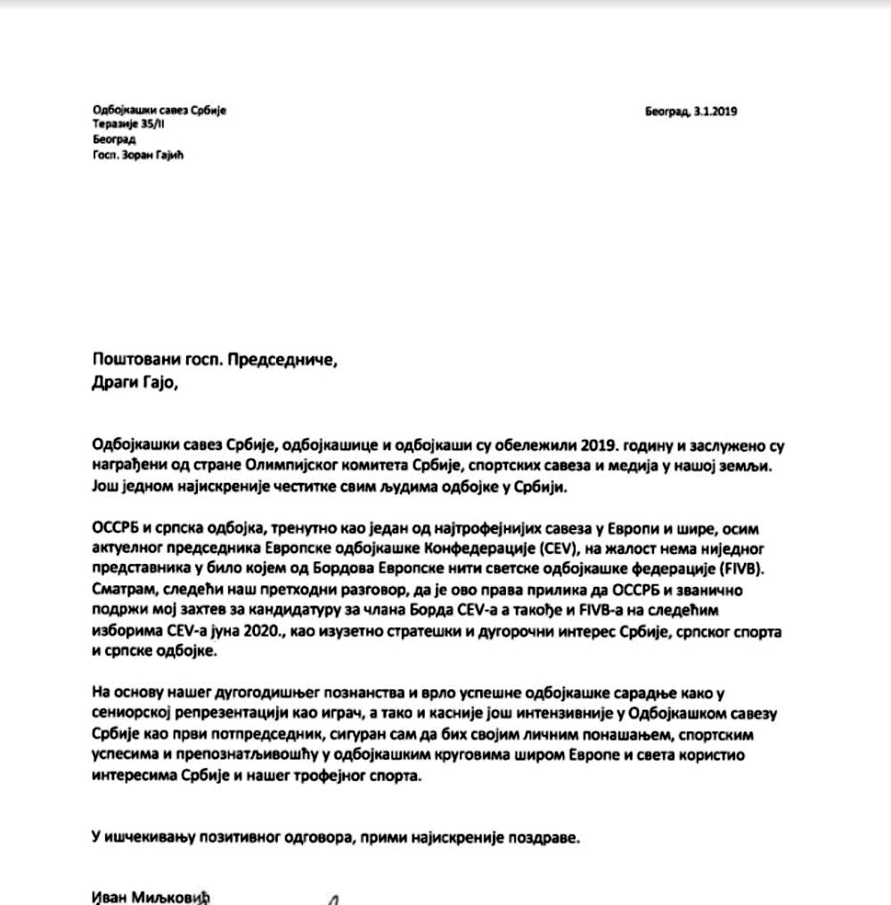Proslavljeni srpski odbojkaš, Ivan Miljković poslao je pismo predsedniku OSS, Zoranu Gajiću, u kojem je zatražio podršku za predstojeću kandidaturu za člana Borda CEV-a.
