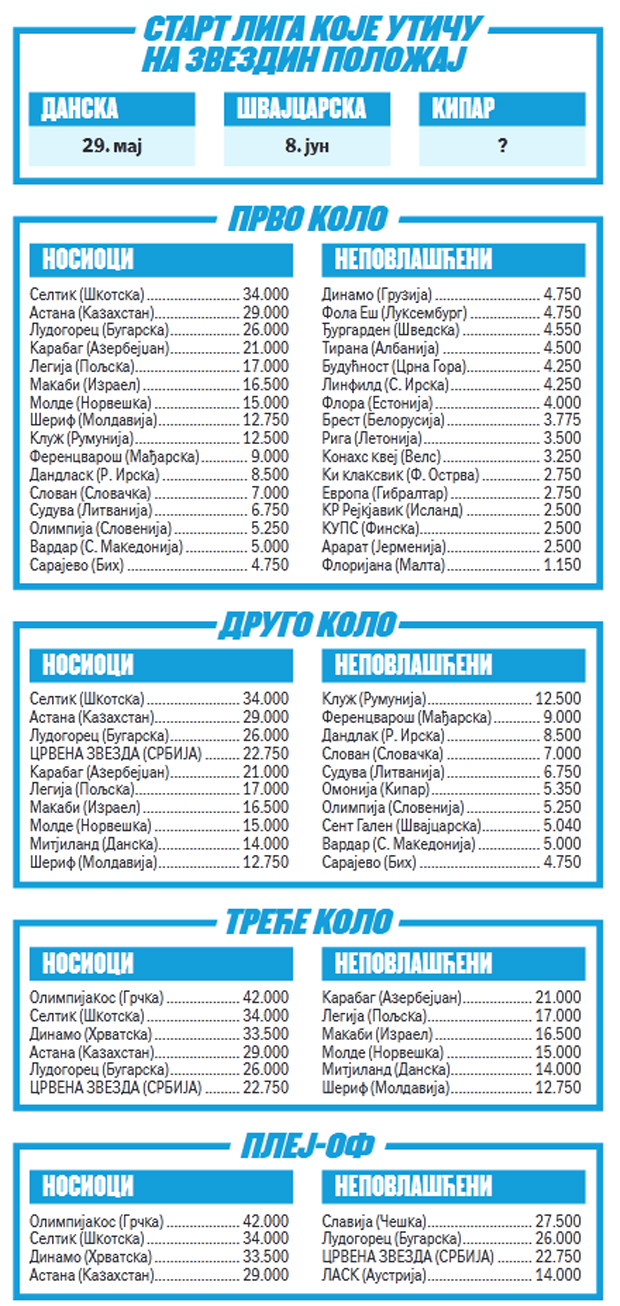 To su tri uslova koja bi „morala“ da budu ispunjena kako bi Crvena zvezda bila nosilac pred treće kolo kvalifikacija, koje će da se obavi između dva meča druge runde. Olakšavajuća okolnost je da je tu i opcija da se neko od favorita oklizne na startnom koraku, ali mala je verovatnoća da se to dogodi Seltiku, Astani i Ludogorecu.