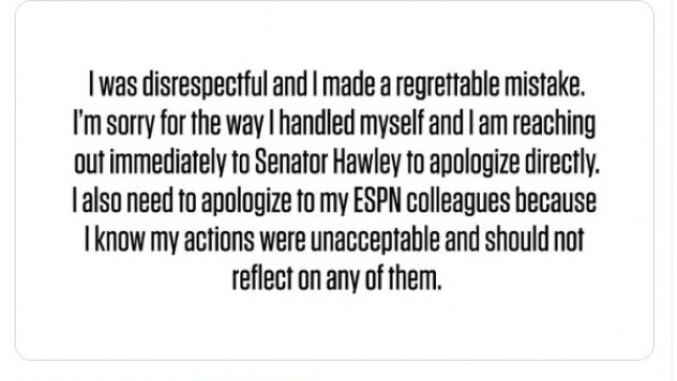 - Nisam imao poštovanja i napravio sam grešku zbog koje se kajem. Nisam se dobro poneo i senatoru se lično izvinjavam, kao i svojim kolegama sa ESPN zbog neprihvatljivog ponašanja - napisao je Vojnarovski na "Tviteru".